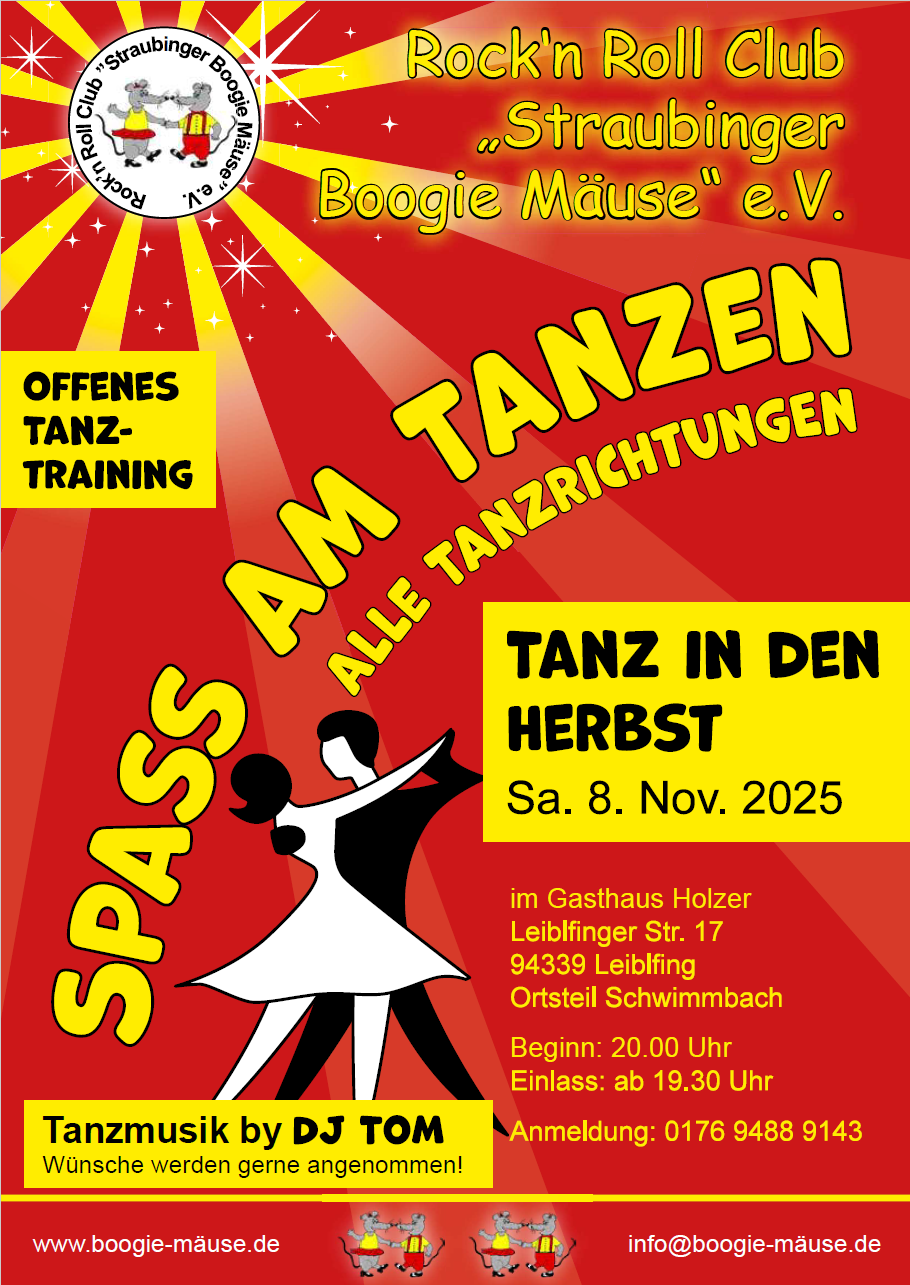 Offenes Tanztraining für Standard Tänzer Gasthaus Holzer, Schwimmbach (Leiblfing) Einlass: ab 19:00 Uhr | Beginn: 20:00 Uhr Anmeldung unter: 0176 9488 9143 Kommt vorbei und tanzt mit uns!