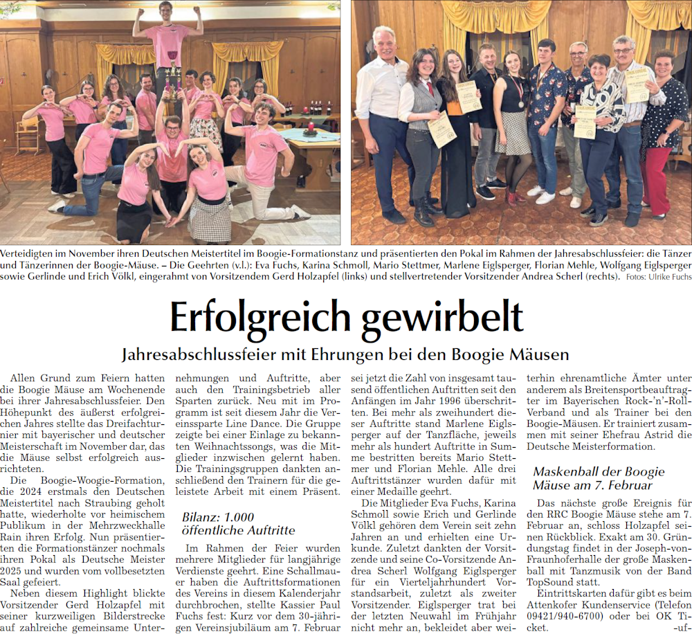 Jahresabschlussfeier mit Ehrungen bei den Boogie Mäusen. Bericht Straubinger Tagblatt 18.12.2025